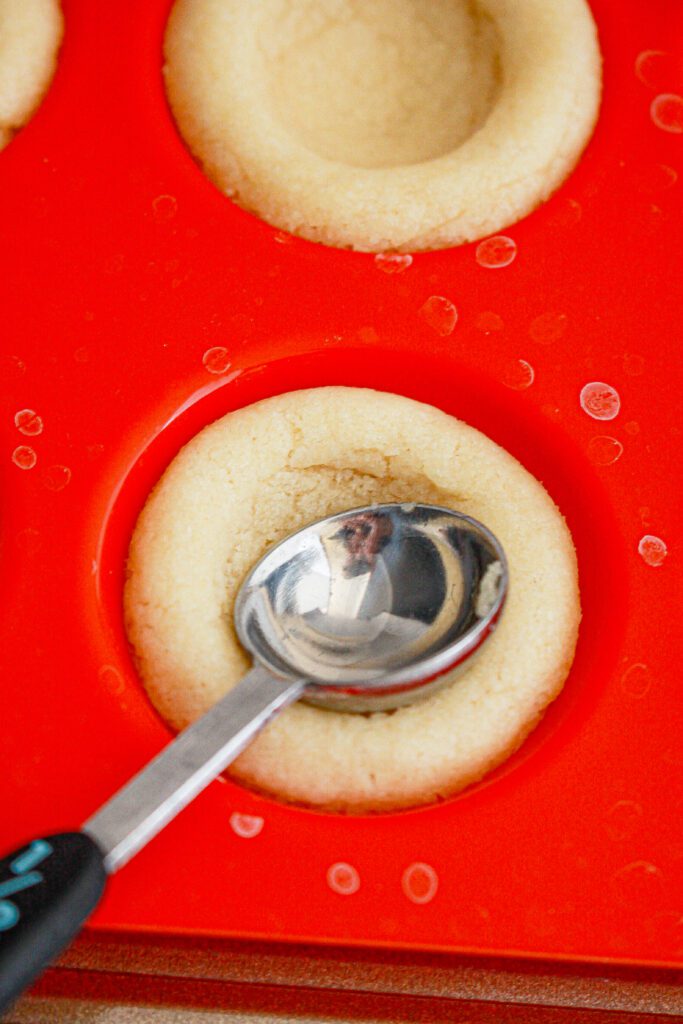 - Place in the oven and bake for 8-10 minutes, just until the edges start to turn golden brown. Remove and immediately press the centers down to form a well in the middle of each cookie (the back of a small teaspoon works well to create the indent). Set aside and let cool.
