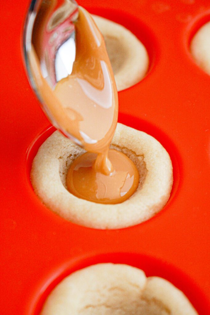 Start by preheating your oven to 350°F and greasing a mini muffin pan. In a bowl, beat the butter and sugar until light and fluffy. Add the egg white and vanilla, mixing well. Next, incorporate the salt, baking powder, and flour until the dough begins to form. Roll the dough into small balls and place them into the muffin cups, flattening slightly. Bake for 8-10 minutes until golden. As soon as they come out of the oven, press the centers down to create a well for the caramel.