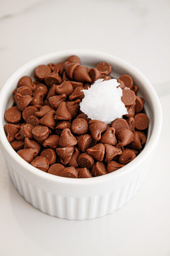 - In a small microwave safe bowl, melt the chocolate chips and coconut oil, stirring frequently until completely smooth.