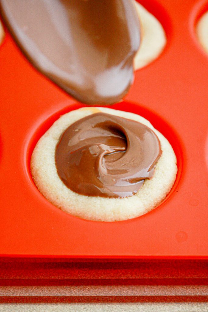 - In a microwave safe bowl, place the caramels and the heavy cream and melt in short bursts, stirring each time, until the caramel is completely smooth. Spoon about 1⁄2 – 1 teaspoon of caramel into each cookie well. Once each cookie has caramel, place the pan into the refrigerator for 15-20 minutes to set the caramel.