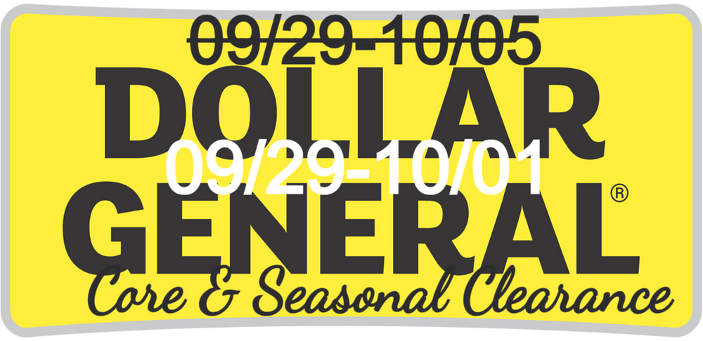 WELL here we are, a memo has come down from corp changing the dates From 09/29-10/01 only three days! Dollar General will now have a clearance event that includes CORE items. This means ANYTHING in your clearance section now will be an extra 50% off. This means it is 50% off the sticker price, AGAIN 50% OFF STICKER PRICE.