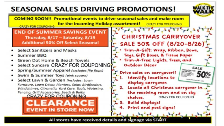 What: Dollar General End of Season Clearance Event. 50% off SEASONAL only. This is not a CORE EVENT (regular clearance) ONLY SEASONAL. This will be 50% off the price right now. This is not an extra 50% off whatever it scans