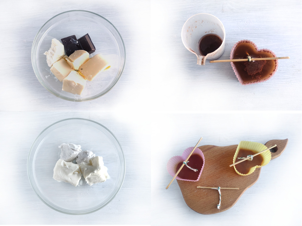 For the exotic coconut candle, mix the butter and coconut cream in a bowl. You can add a little powdered sugar if desired (I didn't). Pour the coconut butter into the molds and send all the molds to the freezer.