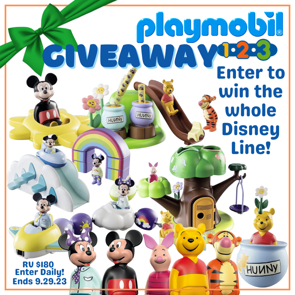One winner will receive all six playsets in the Playmobil 1.2.3 & Disney Line (RV $180). Open to U.S. residents of the 48 contiguous United States. You must be 18 years old to enter to win. This giveaway ends at 11:59 PM EST on 9.29.22. See below for terms and conditions.