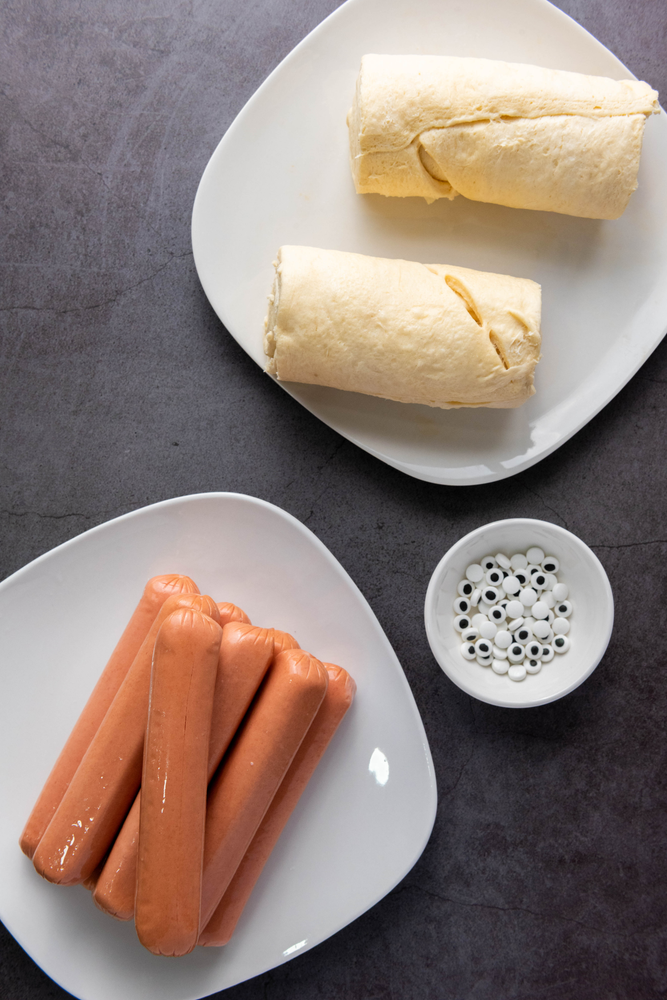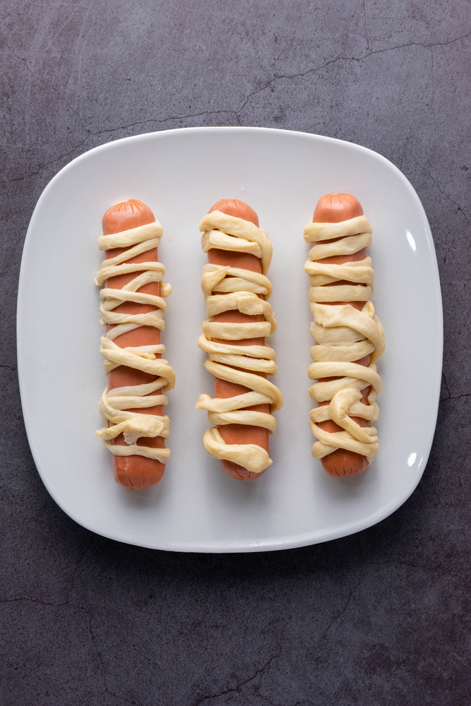 · Wrap the Hot Dogs: Take one hot dog and start wrapping it with a crescent roll strip, leaving a small gap for the face. Continue wrapping until the hot dog is covered, resembling a mummy.