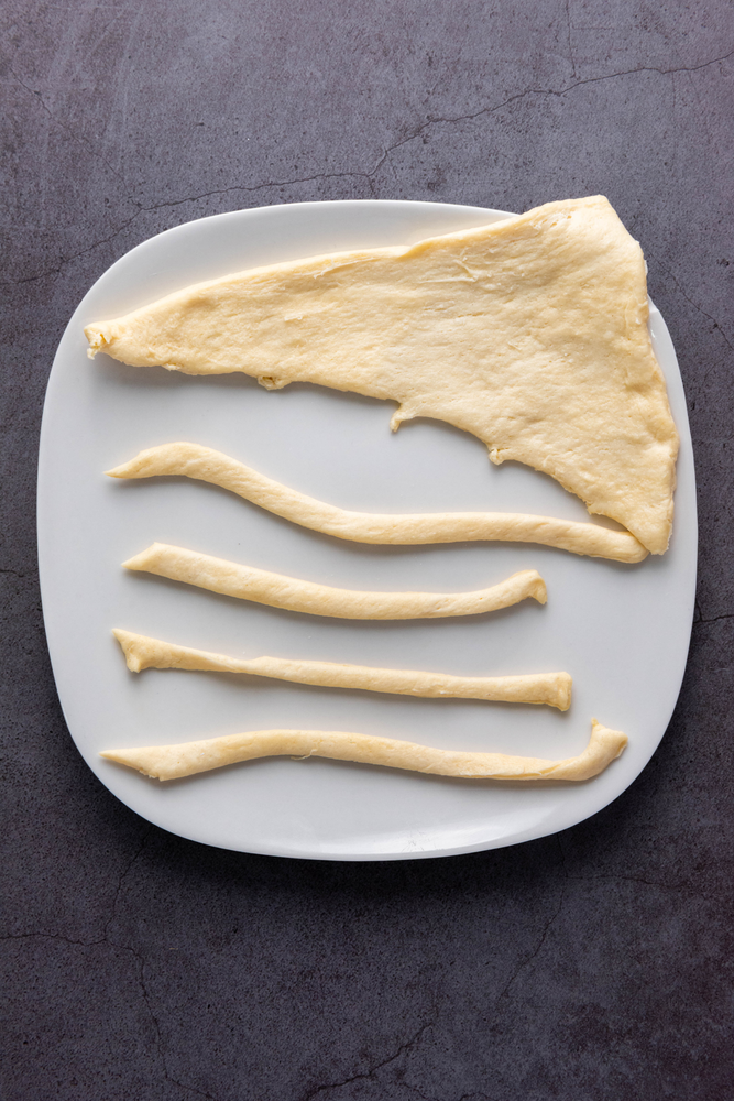 · Using a knife or pizza cutter, slice each triangle into thin strips (about 1/4 inch wide).