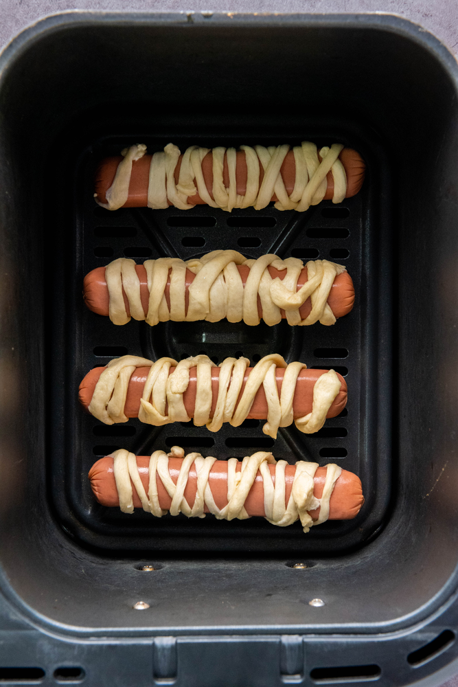 · Air Fry the Mummy Dogs: Place the wrapped hot dogs in the air fryer basket, making sure they are not touching each other.