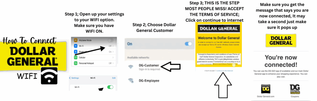 Here are the steps to make sure you are correctly connected to the Dollar General WiFi